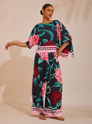 Mismatched Satin Floral Slash Neck T shirt Set