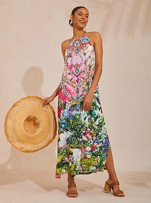 Sunset Bloom Reverie Silky Satin Floral Maxi Dress