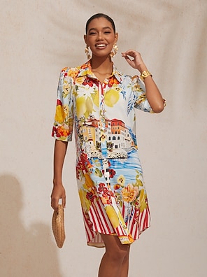 Scenic Floral Satin Straight Shirt Dress