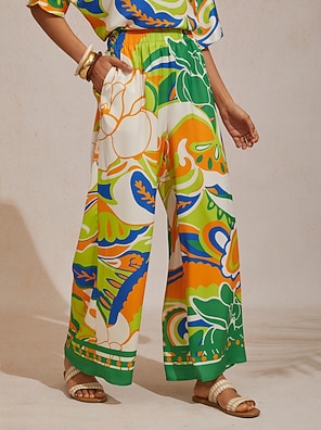 pantalon large en satin soyeux à motif palmiers, idéal pour les soirées d'été