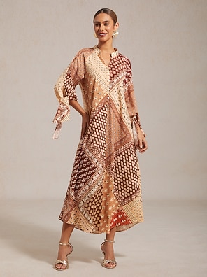 Ethnic Print Chiffon V Neck Midi Dress