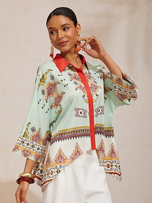 Hemd aus seidigem Satin mit Dolmanärmeln und ethnischem Totem-Motiv