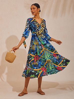 Ethnic Floral Print Chiffon V Neck Midi Dress