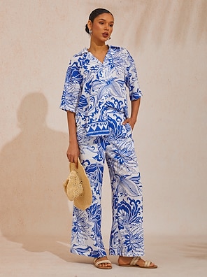 Satin Floral Slash Neck Two Piece Shirt Set