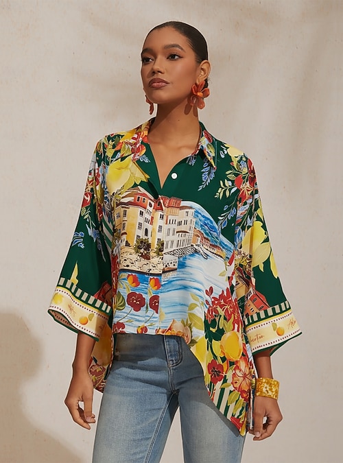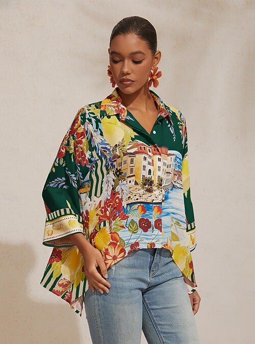 Santorini Sommer-Chiffon-Hemd mit Dolman-Ärmeln und City-Print