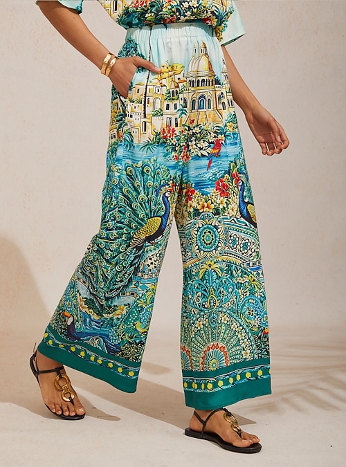 Balearic Islands Blue Satin Elastic Waist Straight Pants