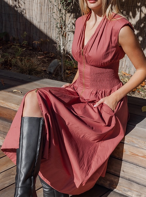 Casual Ruched Zipper Tank Midi Dress