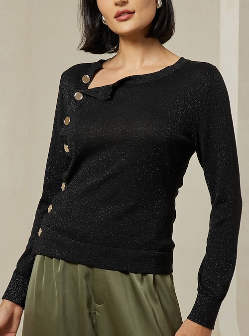 Slash Neck Button Up Cropped Knit Top