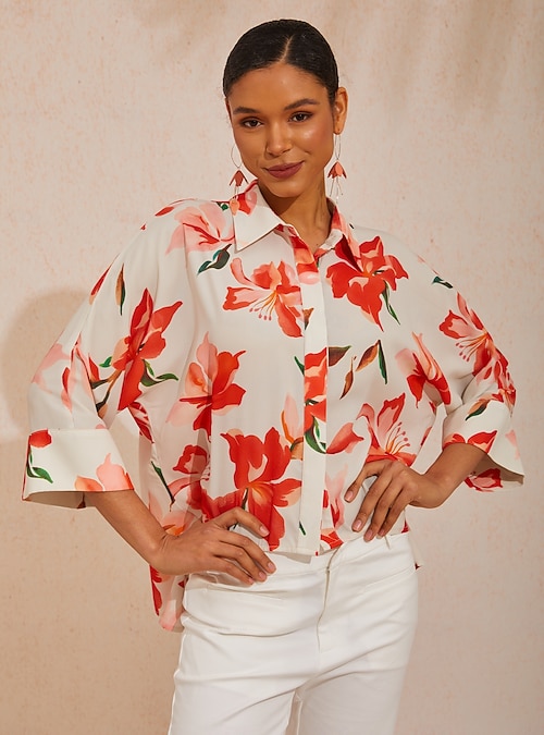 Spring Blooms Flowy Chiffon Asymmetrical Dolman Sleeve Blouse