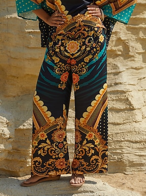 Pantalones de pierna ancha con estampado de cítricos navideños y aspecto de lino vaporoso.