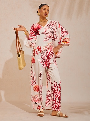 Pantalones florales de satén sedoso con estampado de palmeras hawaianas