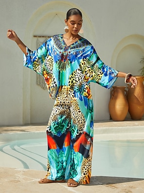 Mujer Caftán Bloque de color Flores Casual Hogar De Compras Verde Trébol Escote en V Holgado Manga Larga 3/4 de Mangas Vacaciones Casual / Diario Corte Ancho Escote en Pico Verano Primavera Primavera