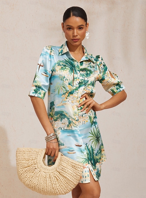 Vestido camisero recto de satén sedoso de la Riviera de la Costa Azul