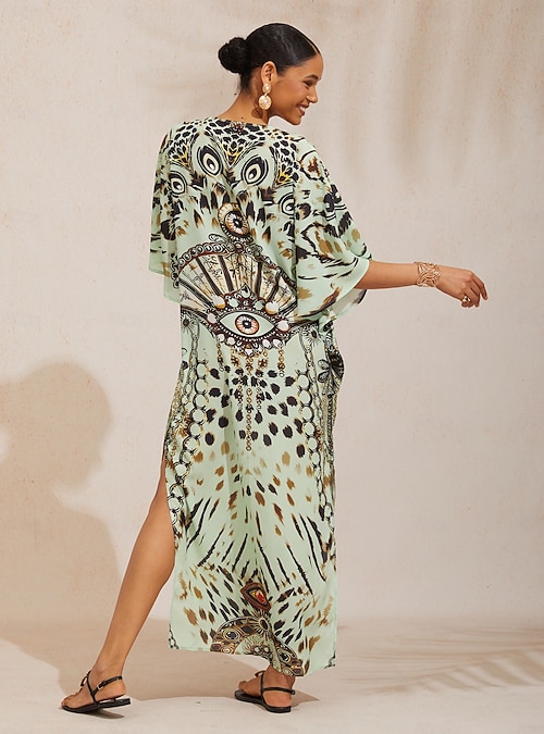Vestido largo de gasa con mangas murciélago y joyas de leopardo vintage