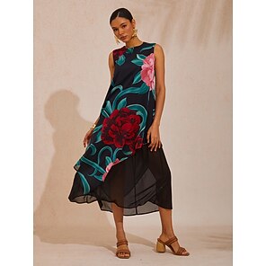 Robe longue fluide en mousseline à fleurs et palmiers hawaïens