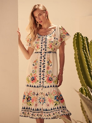 Resort Puff Sleeve V Neck Midi Dress