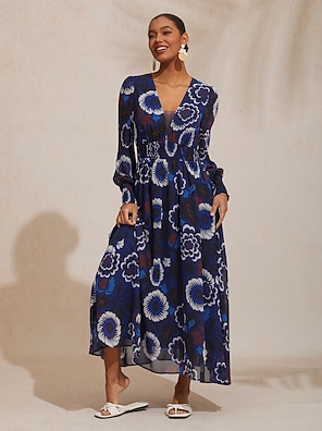 robe longue froncée en satin soyeux, motif rêve d'hibiscus sauvage