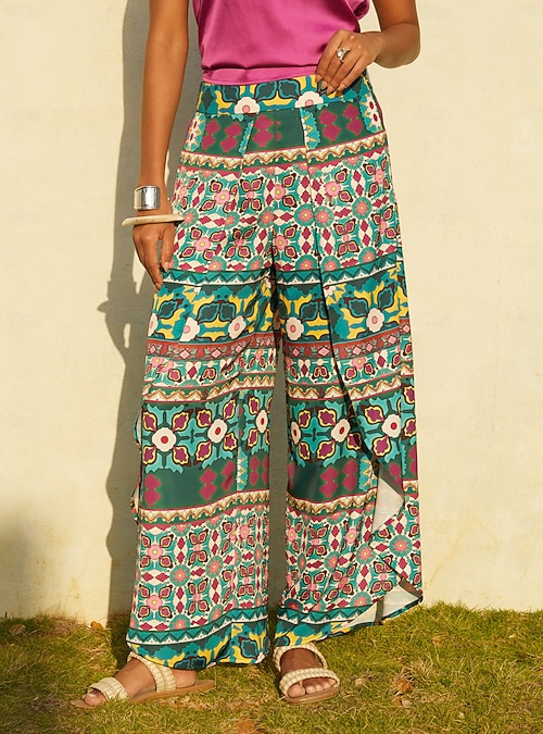 Geometric Satin Floral Pants Wide Leg Casual
