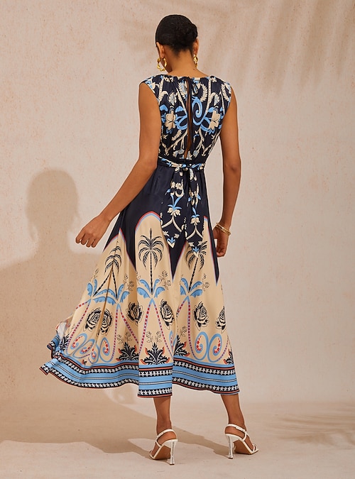 robe longue en satin soyeux à motif palmiers, idéale pour les soirées d'été