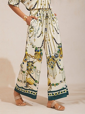 pantaloni a gamba larga in raso setoso con stampa paisley in stile boho