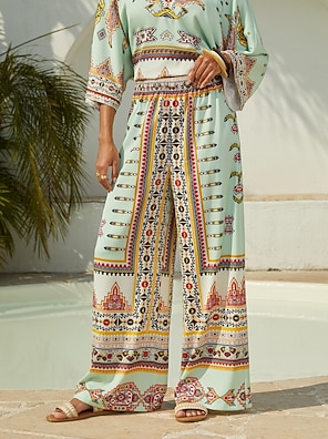 Artistic Print Linen Like Elastic Waist Wide Leg Pants
