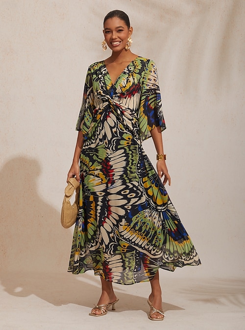 Butterfly Print Waist Defined Chiffon Maxi Dress