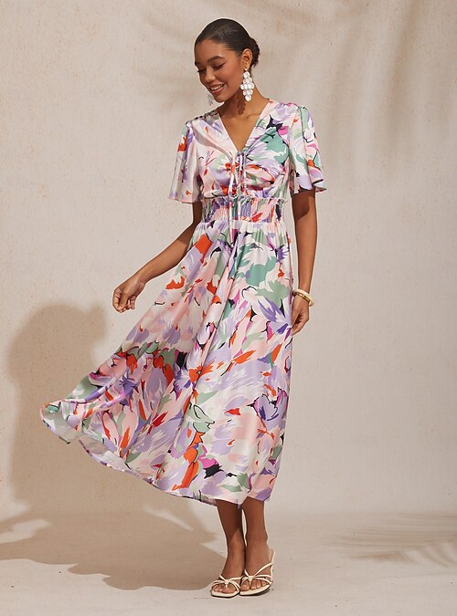 Vacation Color Block Floral Ruched Maxi Dress