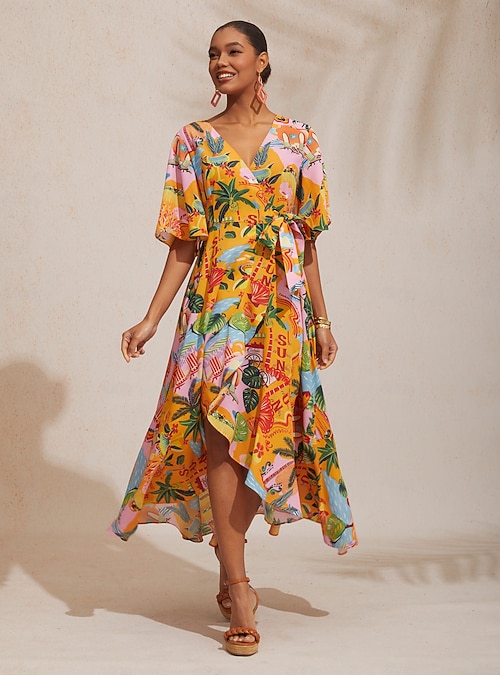 Beach Print Crisscross Satin Maxi Dress