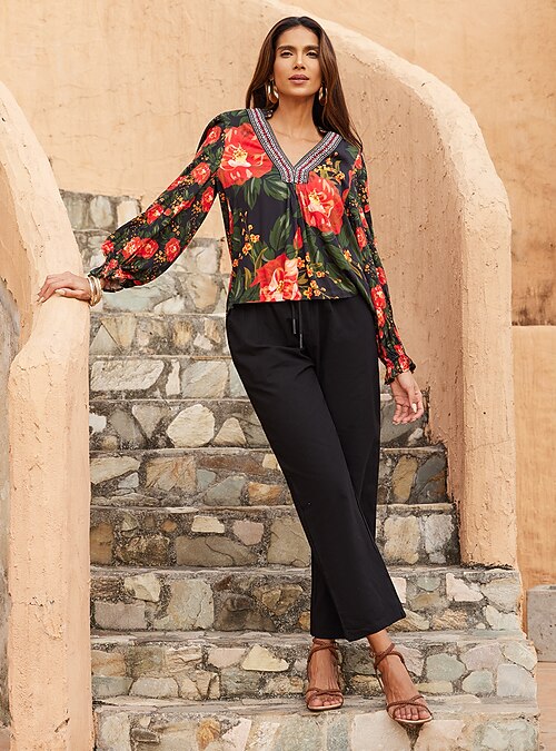 Women's Elegant Floral Print V Neck Puff Sleeve Vacation Shirt #18399267