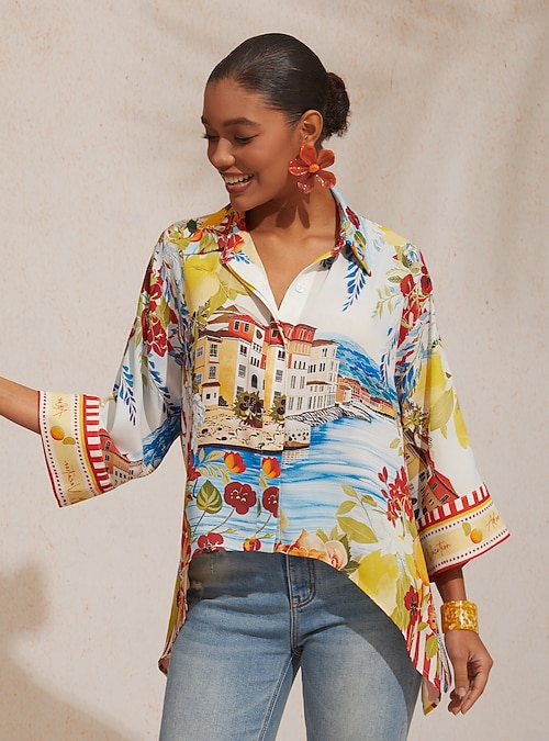 Scenic Floral Chiffon Dolman Short Shirt