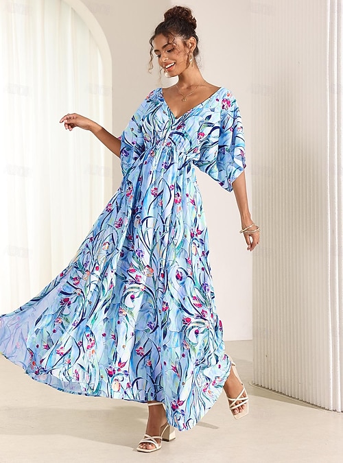 Satin Floral Print V Neck Hawaiian Vacation Maxi Dress