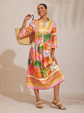 Art Print Linen Feel Waist Cinching Maxi Dress