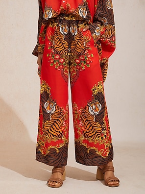 Calça de pernas largas e fluida em chiffon na cor Scarlet Tigress, com cintura elástica.